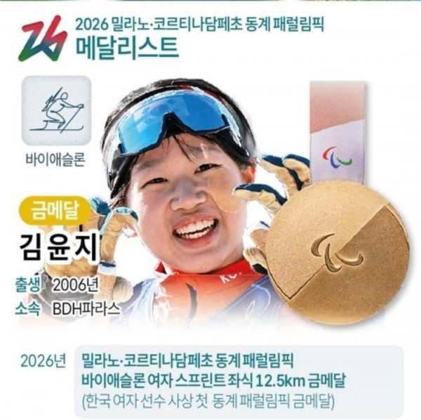 김윤지, 동계 패럴림픽 한국 여자선수 사상 첫 금메달 '새 역사' 페이지 정보 작성자 관리자 조회25회 작성일 26-03-09 18:21 본문 전국장애인부모연대 서울지회 회원 자녀 김윤지선수 금메달소식입니다서대문주활 전담선생님 자녀입니다~많이많이 축하해주세요김윤지, 동계 패럴림픽 한국 여자선수 사상 첫 금메달 '새 역사' 목록