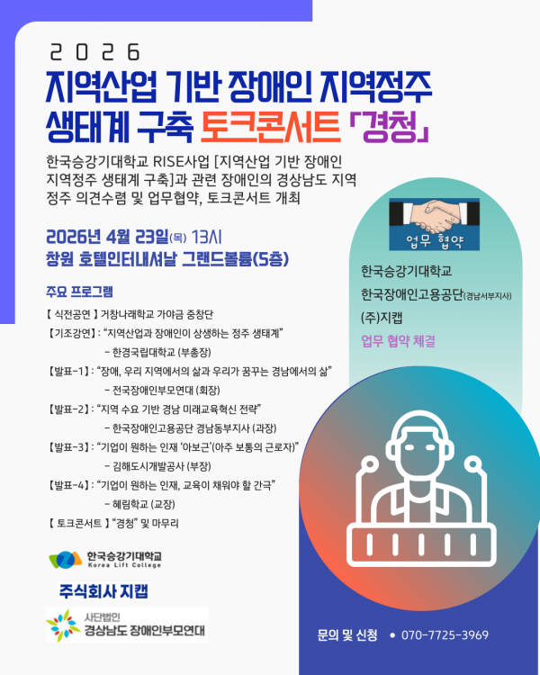 지역산업 기반 장애인 지역정주 생태계 구축 토크콘서트 안내 페이지 정보 작성자 관리자 댓글 0건 조회 26회 작성일 26-04-15 13:28 목록 답변 본문 관심있는 분들은 사무국으로 신청해 주세요 070-7725-3969 댓글 0 댓글목록 등록된 댓글이 없습니다.
