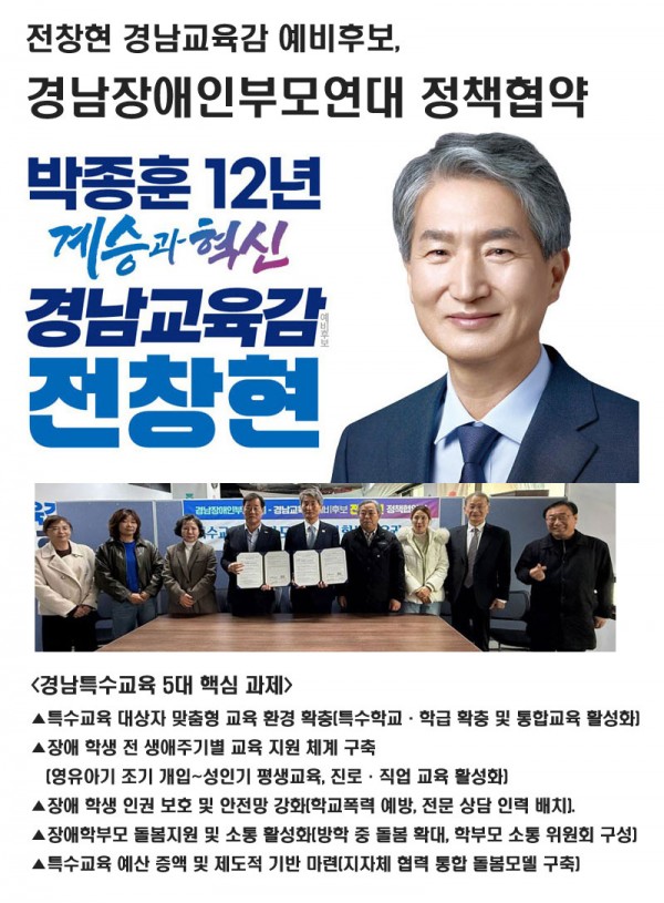 ○ 전창현 경상남도교육감 예비후보는 9일(월) 오후 2시, 선거사무소에서 경상남도장애인부모연대(이하 부모연대)와 함께‘경남 특수교육의 질적 도약과 장애 학생 교육권 보장을 위한 정책협약’을 체결했다.