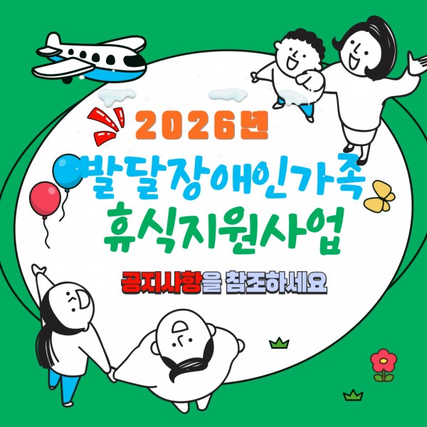 2026년도 발달장애인가족 휴식지원사업 안내(김해, 양산, 밀양, 창녕) 페이지 정보 작성자 관리자 댓글 0건 조회 25회 작성일 26-03-11 18:06 목록 답변 본문 . 댓글 0 댓글목록 등록된 댓글이 없습니다.